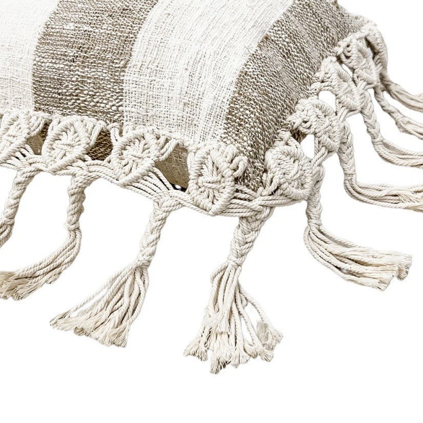 Our Alami macrame cushion cover is lovingly handwoven with a natural textured cotton and jute fibre and macrame fringe detail around the edges. Perfect to add some texture to your bedroom or a living space.