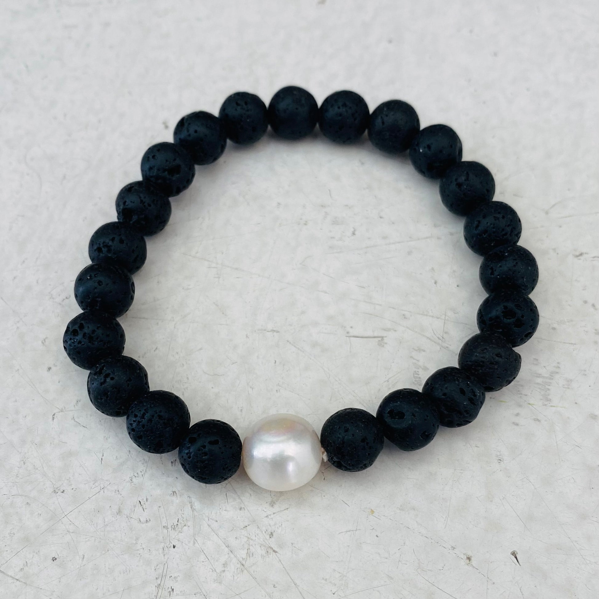 Lava stone beaded bracelet with single freshwater pearl. Beautifully handmade in Bali.